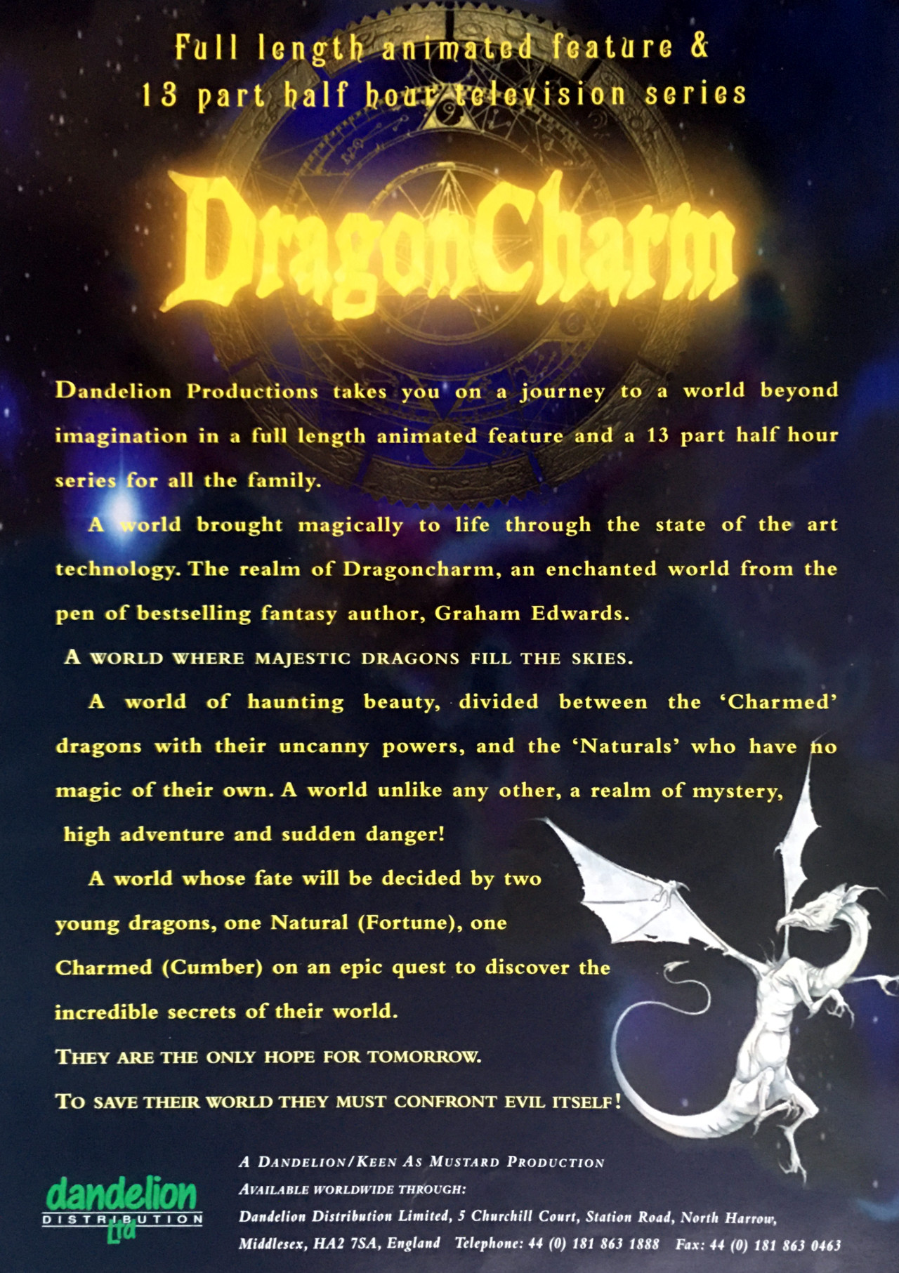 In 1996, my novel Dragoncharm – a fantasy adventure with a cast made up exclusively of dragons – was optioned for TV and movie production by a UK production company called Dandelion Distribution. The novel had been optioned once before, by a company in New York. They were considering a TV adaptation using Muppet-style characters. I’m not aware of any serious work being done on the project during the twelve months they held the rights … and in hindsight I’m rather glad. Foam-rubber dragons were not what I had in mind when I wrote the book.