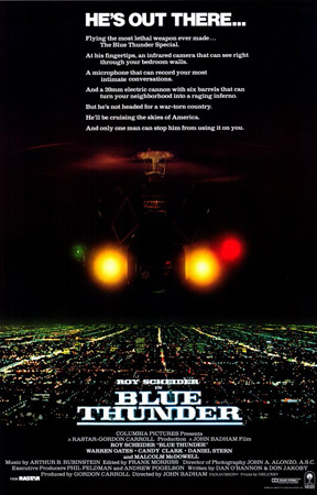 The Blue Thunder effects described here are reminiscent of the work done by Apogee on Firefox. To create composites of F-16 fighters flying over Los Angeles, Dream Quest had to first generate stable background plates (achieved using a gyro-stabilised helicopter platform), then combine them with motion-control footage of model planes. Like Apogee, they solved the problem of bluescreen spill on shiny models by using ultraviolet lighting to generate the matte elements.