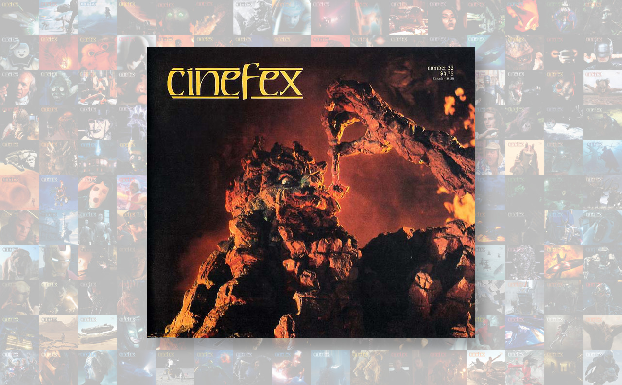 In a scene from Walter Murch’s 1985 film Return to Oz, the monstrous Nome King prepares to devour Dorothy Gale’s new friend Jack Pumpkinhead. This perilous snapshot makes for a striking cover to Cinefex #22, but how many of you were actually able to name the movie? Not everyone, I’m guessing, which is a shame when Return to Oz is unique among feature films in the way it showcased Will Vinton’s innovative Claymation techniques. This issue’s back cover has a still from Bill Norton’s dinosaur adventure from the same year – Baby: Secret of the Lost Legend. Between them, the articles on the two films span 68 pages.