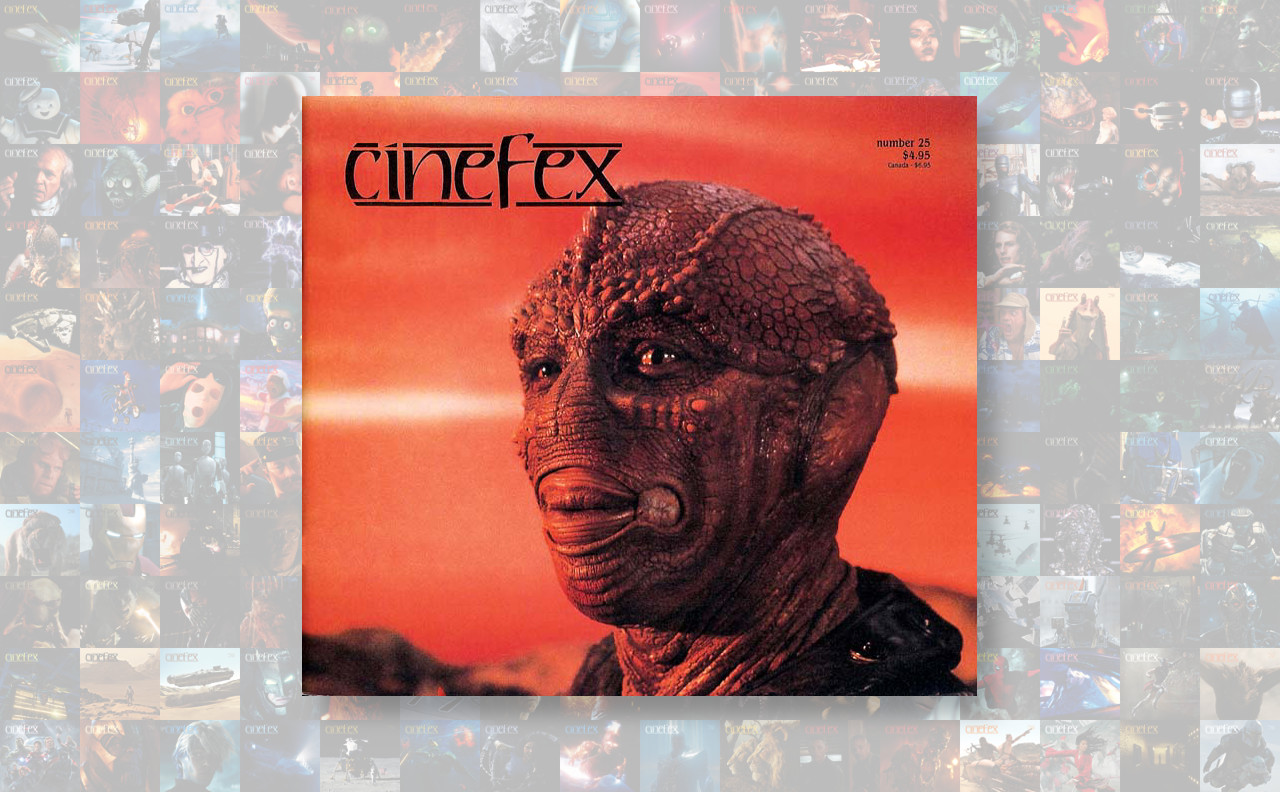 There’s a rule of thumb in the graphic design business: if you want the magazine to sell, put a pretty face on the cover. This is my 25th trip into my personal Cinefex archive, and well over half the covers I’ve looked at more or less follow that rule (remember, in the world of visual effects, even Ray Harryhausen’s hideous Medusa from Clash of the Titans is way past pretty and into the realms of gorgon-gorgeous). This time around, the good looks belong to the alien Drac, played by Louis Gossett Jr in Wolfgang Petersen’s 1985 science fiction film Enemy Mine. The back cover features the equally attractive vampire Jerry Dandridge from the original Fright Night. Altogether, this issue contains three articles, spanning 72 pages.