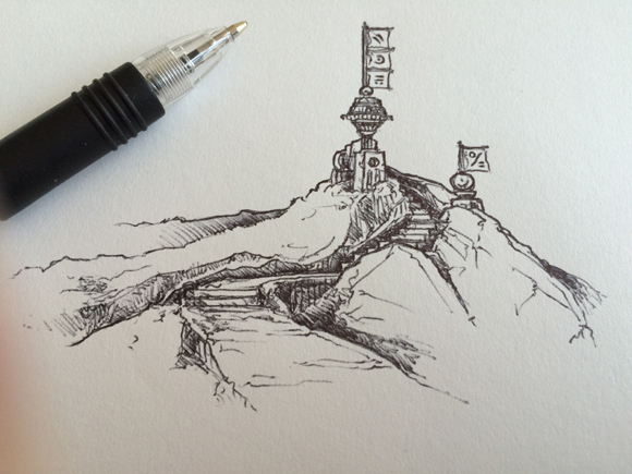 Inspired by last night’s rediscovery of Kagemusha, I spent a happy 90 minutes today sketching. I’ve called the resulting drawing Watchtower. It’s not a patch on a Kurosawa frame, nor is it really very Japanese, but it captures a little of the feeling I was left with after watching the movie. A feeling that places exist other than those which we know.