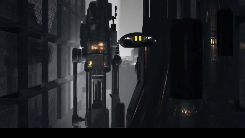 I built the city from basic geometry in Strata Design 3D, dressed up with a few high-tech bits and bobs culled from the built-in shape library. The city layout is really minimal – I only built what was visible through the camera. Honestly, if you zoom out from the model, there’s hardly anything there. I modeled a super-simple flying car and mapped on a bunch of sci-fi panel textures.