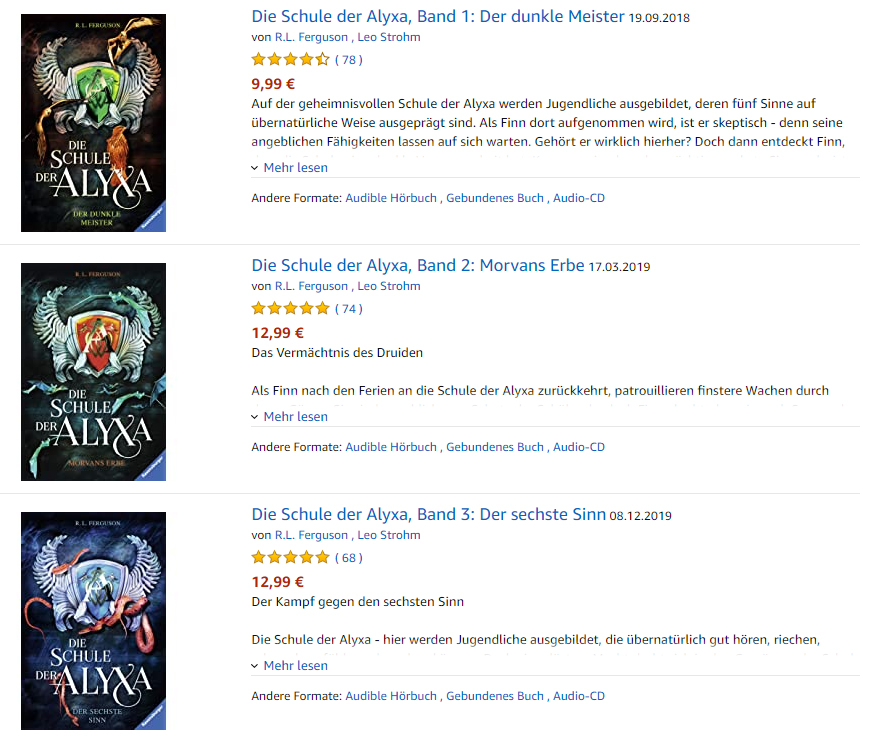 My fantasy adventure trilogy School of Alyxa is finally complete, in its original German incarnation, at least. What’s more, I’m delighted to report the three novels have been picking up a heap of 5-star reviews on Amazon.