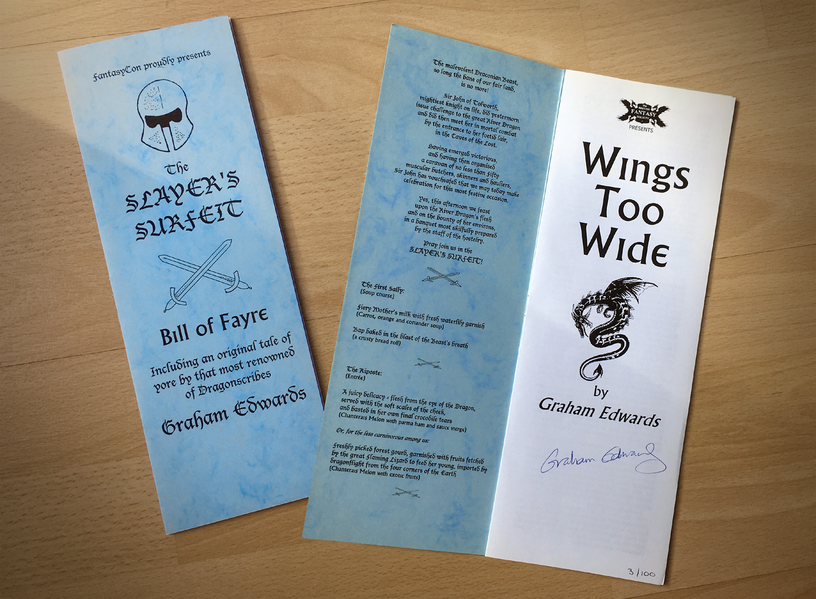 Wings Too Wide is a short story I wrote for FantasyCon 2000. Organised by the British Fantasy Society, FantasyCon is an annual celebration of all things wonderful in speculative fiction, culminating in the spectacular British Fantasy Awards ceremony.