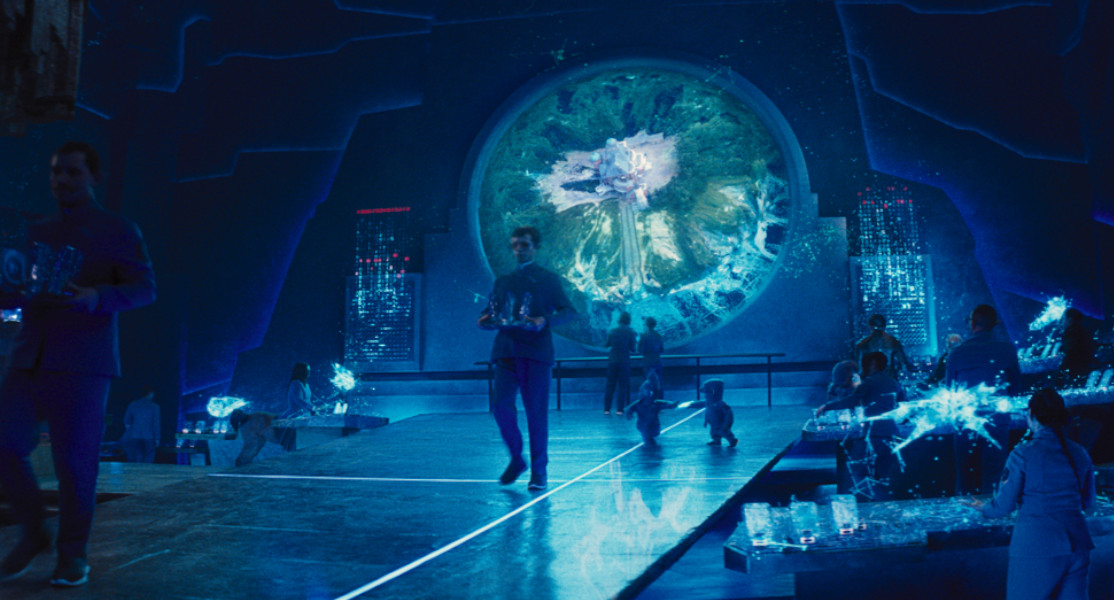 The actors were illuminated by a central bulb hanging slightly above the Aculos prop. The intensity of this light source steadily increased through the sequence. ILM added its CG Aculos and the phantasmagorical light show it generates. “It was an incredibly complex bit of roto and cleanup,” Julian Foddy stated. “The camera was dollying in a circle around the table and the light was putting a big blue anamorphic lens flare right through the middle of the frame. We had to clean that up before we put our CG in, then put the flare back again.”